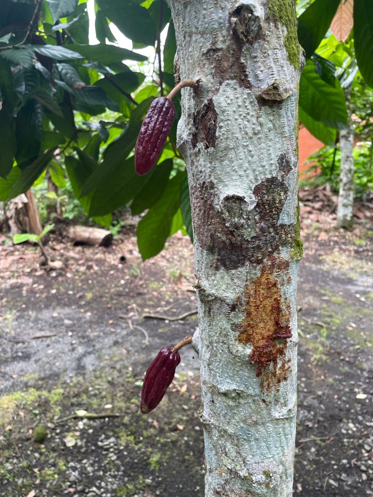 A cacao tree with two developing cacao pods growing directly from the trunk